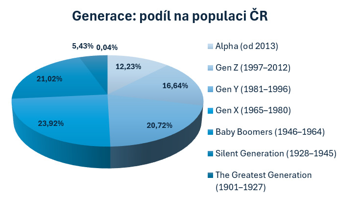 Nejsilnější je nyní Generace X, tedy lidé ve věku 45 až 60 let, kterých je v české populaci 2,6 milionu, tedy 23,92 procenta, dvě okolní generace – tedy takzvaní boomeři a mileniálové mají podobně těsně pod 2,3 milionu členů, tedy zhruba 21 procent. Počet lidí v generaci Z je více 1,7 milionu, tedy 16,6 procenta z celkových 10,9 milionu obyvatel ČR.