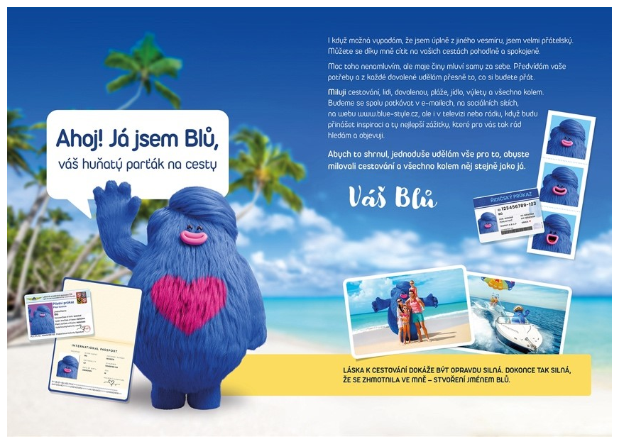 Praha, 17. 6. 2024 – Unikátní sympatický parťák na cesty jménem Blů je novým maskotem CK Blue Style – největšího samostatného subjektu na trhu českých cestovních kanceláří. Objevuje se jak v reklamních kampaních, tak na webových stránkách a v další komunikaci firmy. Ta staví na svých hlavních základech, kterými jsou: vášeň pro cestování, zákazník na prvním místě, vysoký standard péče a kvality služeb a přístup a hodnoty rodinné firmy. Všechny tyto priority v sobě zahrnuje i brand claim „Dovolenou pro vás děláme s láskou“, který firma nadále používá a promítá do emočně vřelé, optimistické, důvěryhodné a moderní komunikační strategie.