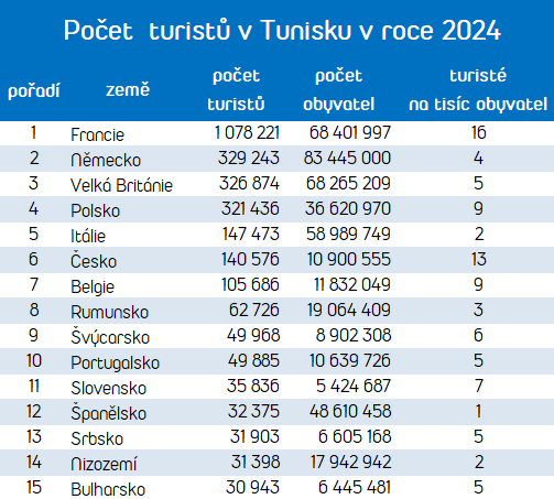 Praha, 16. 4. 2025 – Češi jsou v Tunisku jedni z nejpočetnějších turistů. V přepočtu na obyvatele se dokonce řadí na druhé místo, hned za Francouze. Ačkoliv v absolutních číslech jsou až na šesté pozici, tento poměr svědčí o silném zájmu Čechů o tuto destinaci. Vyplývá to z čerstvých dat Tuniského národního úřadu pro cestovní ruch.